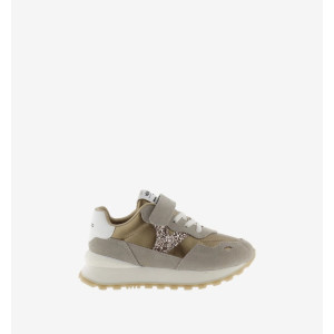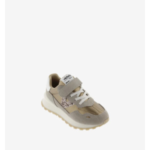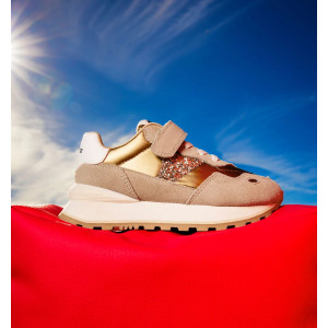 AIRE KIDS di Victoria sono le sneakers che si distinguono per il loro design e comfort. Con una finitura metallica, un effetto imbottito e un logo glitterato e testurizzato sul lato, queste sneakers aggiungono un tocco di lucentezza e sofisticazione. Realizzate con un mix di nylon morbido, pelle scamosciata ed effetto pelle, combinano perfettamente stile e funzionalità. La loro leggerezza e carattere sportivo sono esaltati da dettagli come la suola larga e lo stabilizzatore del tallone. La chiusura con lacci elastici e una fascia a strappo facilita la calzata e promuove l'autonomia.