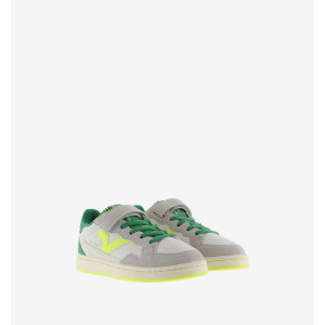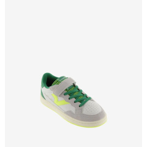 sono scarpe sportive per bambini in pelle effetto con inserti fluo e fantasia. Chiusura con laccio elastico, accompagnato da una striscia adesiva che facilita la calzata e garantisce sostegno, favorendo l'autonomia. Suola bicolore con finitura invecchiata. Include inoltre una soletta ergonomica che si adatta alla forma del piede, offrendo una sensazione di comfort.