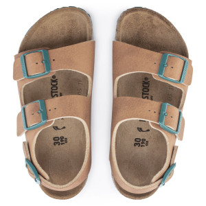 Il modello Milano Kids di Birkenstock è uno dei modelli più tradizionali della linea Birkenstock e da sempre riscuote un notevole successo. Perfetti per i piedini dei bambini, coniuga 2 cinturini regolabili con fibbia ad uno che si chiude alla caviglia. Questa versione è in Birko Flor che presenta una texture simil pelle e la colorazione è il Ginger Brown caratterizzato da fibbie e suola a colore in contrasto. Oramai diventato un classico nelle linee Birkenstock, questo sandalo ha la pianta nella versione Stretta con il plantare anatomico nella versione classica di Birkenstock. Questo è in sughero, un prodotto naturale che isola dal caldo e presenta ottime proprietà ammortizzanti che ti donerà comfort. E' a sua volta ricoperto in pelle scamosciata che rimane morbida al tatto e flessile adattandosi delicatamente al piede. La suola in EVA è leggera e antiscivolo. Diventato un classico nelle linee Birkenstock, è adatto per chi pretende un classico dal proprio Birkenstock e a chi vuole essere sempre all'ultima moda.