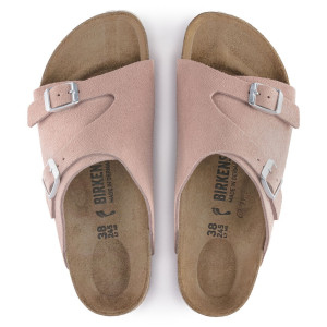Vista la grande richiesta il modello Zürich di Birkenstock è tornato a far parte della collezione. Un morbido fascione regolabile grazie a due fibbie avvolge dolcemente il piede.  Il modello ha la pianta nella versione Stretta con il plantare anatomico nella versione classica di birkenstock. Questo è in sughero, un prodotto naturale che isola dal caldo e presenta ottime proprietà ammortizzanti che ti donerà ancora maggior comfort. E' a sua volta ricoperto in pelle scamosciata che rimane morbida al tatto e flessile si adatta delicatamente al piede. La tomaia è in pelle scamosciata ( suede) e la colorazione è uno dei più classici e intramontabili:  Pink Clay.