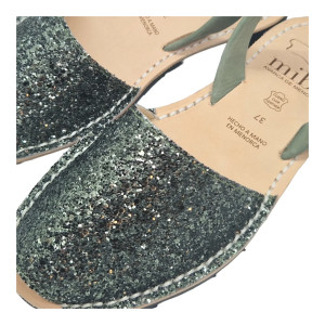 La vera Minorchina di Mibo è realizzata in morbida pelle e glitter in vari colori e presenta la classica suola in gomma mentre la pianta è realizzata in spessa pelle di vacchetta naturale. Questo sandalo tradizionale è caratterizzato da comfort, resistenza e design minimalista ed un leggero tacco di 1,5 cm. Uno dei nostri best-seller per la bella stagione, è realizzato a mano con materiali di alta qualità per offrire durata, resistenza e comfort oltre che eleganza.