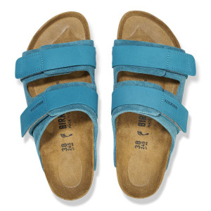 Il modello Uji di Birkenstock è fresco e sportivo e si contraddistingue per le due chiusure regolabili individualmente grazie ad un doppio velcro e riprende la linea del modello più iconico della collezione. Due fasce avvolgono dolcemente il piede che viene sostenuto dal famoso plantare. La tomaia in questa versione viene presentata in pelle scamosciata particolarmente morbida, che aderisce al piede come una seconda pelle, in combinazione a pregiata pelle nabuk. La colorazione è il nuovo Deep Turquoise che è attuale, di moda ed è facilmente abbinabile. Il modello ha la pianta nella versione Stretta con il plantare anatomico nella versione classica di birkenstock. Questo è in sughero, un prodotto naturale che isola dal caldo e presenta ottime proprietà ammortizzanti ed è a sua volta ricoperto in pelle scamosciata che rimane morbida al tatto e flessile e si adatta delicatamente al piede. La suola in EVA è leggera e antiscivolo Chi non ha mai provato Arizona non sa cos'è Birkenstock.