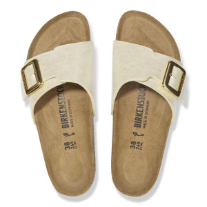 Il design di BIRKENSTOCK Catalina Cushion Buckle con il suo cinturino e la fibbia in metallo è ispirato al grande classico Madrid. Il cinturino un po’ più largo conferisce al sandalo un look moderno ed elegante. Qui il sandalo si presenta in una finitura satinata. La nuova fibbia Cushion Buckle è spessa e brillante, leggermente arrotondata, è un particolare tocco di stile. La tomaia è in Birko-Flor®, un materiale sintetico resistente all’usura e delicato per la pelle.