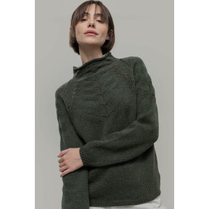 è una maglia lupetto da donna realizzata in 100% lana rigenerata, un materiale caldo e sostenibile perché completamente naturale e biodegradabile. Il mezzo collo è rifinito con un elegante effetto ricciolino, mentre il corpo è decorato con una lavorazione in maglia con motivo a trecce degradé che crea un gioco di texture raffinato.