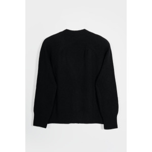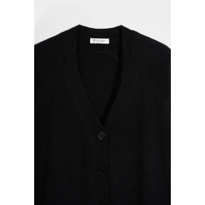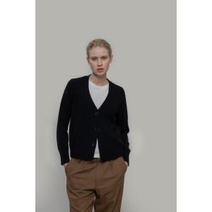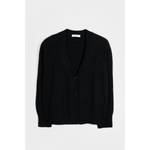 è un cardigan da donna con bottoni e scollo a V realizzato in filato di cashmere rigenerato sostenibile e biodegradabile. Un cardigan corto da donna dalla una vestibilità comoda e una linea boxy che arriva al primo fianco. Il taglio raglan valorizza le spalle, mentre la maglia rasata evidenzia i dettagli sartoriali come le calature sulla schiena e i mini trafori in fondo alle maniche.