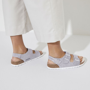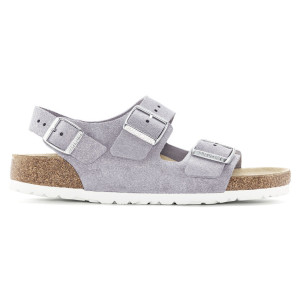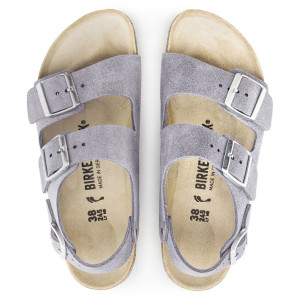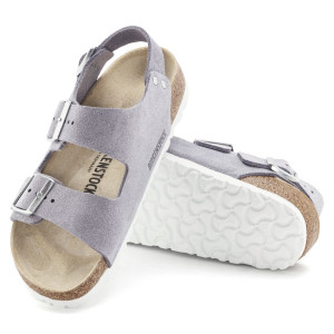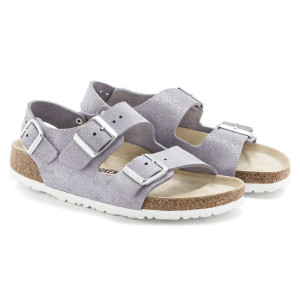 Il modello Milano di Birkenstock è uno dei modelli più tradizionali della linea Birkenstock e da sempre riscuote un notevole successo. Adatto sia da donna che da uomo, coniuga 2 cinturini regolabili con fibbia ad uno che si chiude alla caviglia. Questa versione è in  Suede Leather (camoscio) con effetto luminoso Shimmering e la colorazione è il nuovissimo  Purple Fog. Oramai diventata un classico nelle linee Birkenstock, questo sandalo ha la pianta nella versione Stretta  con il plantare anatomico nella versione classica di Birkenstock. Questo è in sughero, un prodotto naturale che isola dal caldo e presenta ottime proprietà ammortizzanti che ti donerà comfort. E' a sua volta ricoperto in pelle scamosciata che rimane morbida al tatto e flessile adattandosi delicatamente al piede.  La suola in EVA è leggera e antiscivolo. Diventato un classico nelle linee Birkenstock, è adatto per chi pretende un classico dal proprio Birkenstock e a chi vuole essere sempre all'ultima moda.