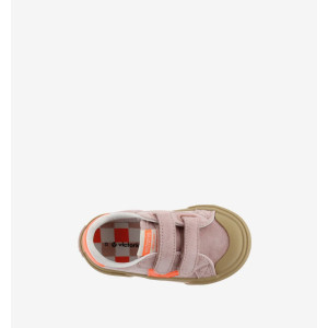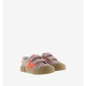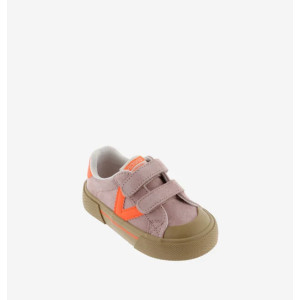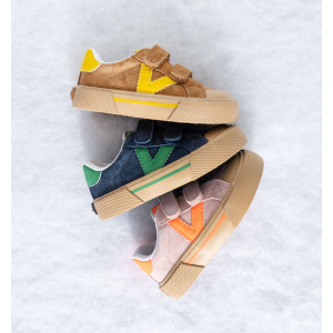 sono delle Sneakers sportive per bambini realizzate in crosta di pelle e inserti sintetici. V laterale e inserto posteriore in colori coordinati a contrasto. Chiusura con due strisce adesive che facilitano la calzata e offrono sostegno. Suola in gomma color caramello con rinforzo sulla punta per maggiore resistenza e durata.