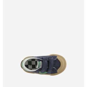 sono delle Sneakers sportive per bambini realizzate in crosta di pelle e inserti sintetici. V laterale e inserto posteriore in colori coordinati a contrasto. Chiusura con due strisce adesive che facilitano la calzata e offrono sostegno. Suola in gomma color caramello con rinforzo sulla punta per maggiore resistenza e durata.