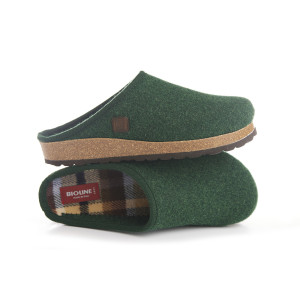 La pantofola sabot 170 di Bioline è uno dei modelli più tipici della tradizione e vengono prodotte con la costruzione strobel, un metodo di lavorazione che permette alla calzatura la massima flessibilità. E' un modello dove il materiale principale utilizzato è il feltro naturale di lana che è caldo, leggero, impermeabile ed è il miglior materiale isolante naturale poichè è molto efficace sia contro il freddo che contro il calore. Il plantare è anatomico ed formato da un misto tra gomma e sughero ed è ricoperto di lana. La suola in microporosa EVA è leggerissima con proprietà antiscivolo. Sono prodotte 100% made in Italy