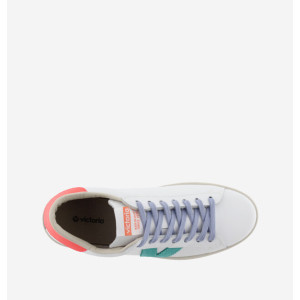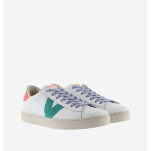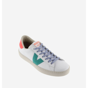 Il modello 126171 è una classica sneakers di Victoria. La tomaia è interamente in pelle di vitello bianco e senza cromo. E' caratterizzata da una V (in camoscio) che insieme al tallone hanno una colorazione a contrasto fluo. La fodera invece è in tessuto e cotone e ciò la rende ideale per la stagione primavera estate. La Suola è trattata con oli vegetali anziché minerali e ciò le rende più biodegradabili.