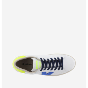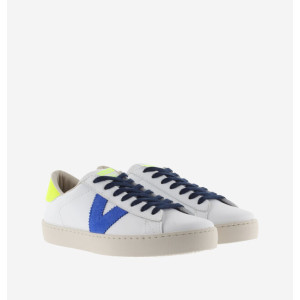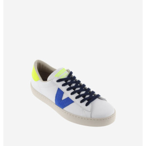 Il modello 126171 è una classica sneakers di Victoria. La tomaia è interamente in pelle di vitello bianco e senza cromo. E' caratterizzata da una V (in camoscio) che insieme al tallone hanno una colorazione a contrasto fluo. La fodera invece è in tessuto e cotone e ciò la rende ideale per la stagione primavera estate. La Suola è trattata con oli vegetali anziché minerali e ciò le rende più biodegradabili.