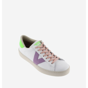 Il modello 126171 è una classica sneakers di Victoria. La tomaia è interamente in pelle di vitello bianco e senza cromo. E' caratterizzata da una V (in camoscio) che insieme al tallone hanno una colorazione a contrasto fluo. La fodera invece è in tessuto e cotone e ciò la rende ideale per la stagione primavera estate. La Suola è trattata con oli vegetali anziché minerali e ciò le rende più biodegradabili.