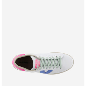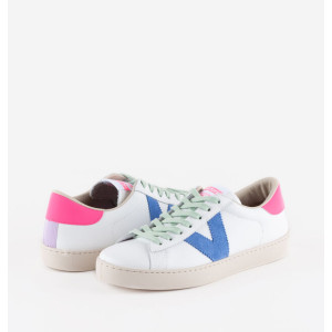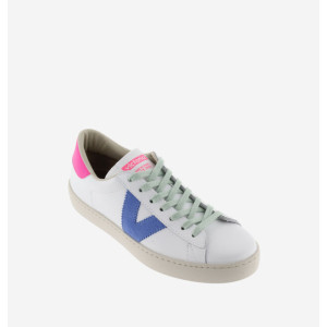 Il modello 126171 è una classica sneakers di Victoria. La tomaia è interamente in pelle di vitello bianco e senza cromo. E' caratterizzata da una V (in camoscio) che insieme al tallone hanno una colorazione a contrasto fluo. La fodera invece è in tessuto e cotone e ciò la rende ideale per la stagione primavera estate. La Suola è trattata con oli vegetali anziché minerali e ciò le rende più biodegradabili.