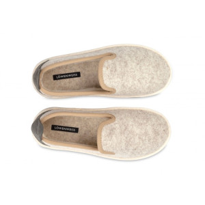 PAL di Lowenweiss è una pantofola in feltro di lana con una fodera in pura lana. Ha una suola lavorata a mano in feltro e lattice naturale. Caratterizza il paio un tallone con linguetta in camoscio.