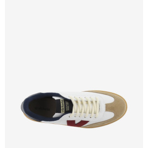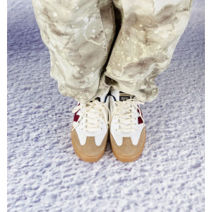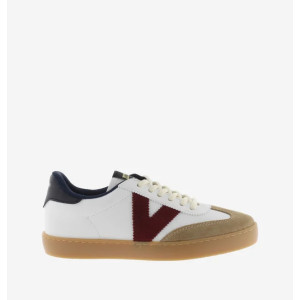 sono delle Sneakers bianche unisex prodotte in Spagna in materiale effetto pelle. Dettagli colorati sulla V laterale e sull'inserto posteriore. Punta in crosta di pelle con nuovo taglio ciclista. La suola traslucida color caramello aggiunge un tocco di stile retrò. Inoltre, includono una soletta più ergonomica, realizzata con materiali riciclati, che garantisce un comfort superiore a ogni passo.