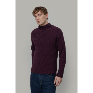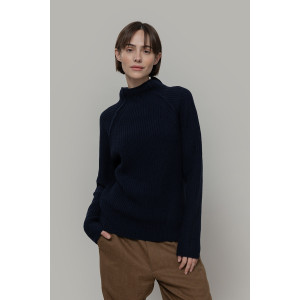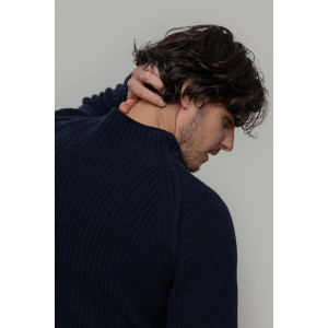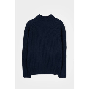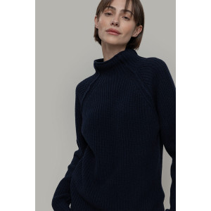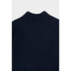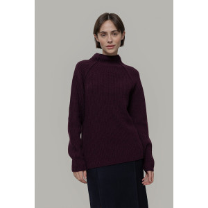 è un maglione a collo alto realizzato in 100% lana rigenerata, un materiale sostenibile e caldo. Il design è essenziale ma ricercato: il collo alto senza bordo è rifinito con un leggero effetto ricciolino, mentre le maniche lunghe raglan sono arricchite da una cucitura esterna in rilievo, mentre la lavorazione in maglia a punto perla dona tridimensionalità e struttura.